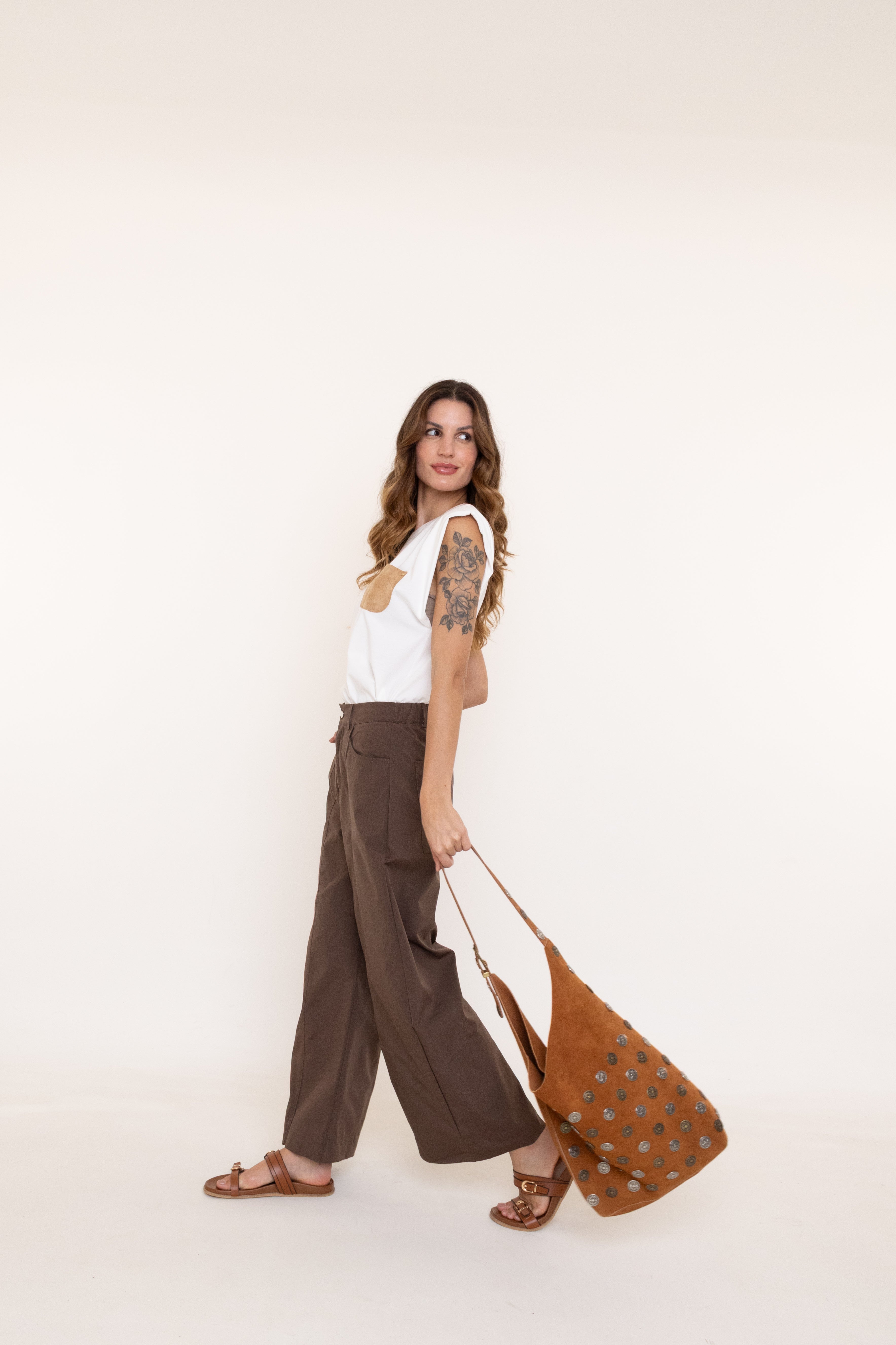 Confeccionada em 100% camurça, destaca-se pelo visual marcante e pela aplicação de taxas metálicas, que adicionam personalidade e atitude à peça. Seu design estruturado e de presença contemporânea a transforma em um acessório de impacto, ideal para composições que pedem sofisticação com toque urbano.