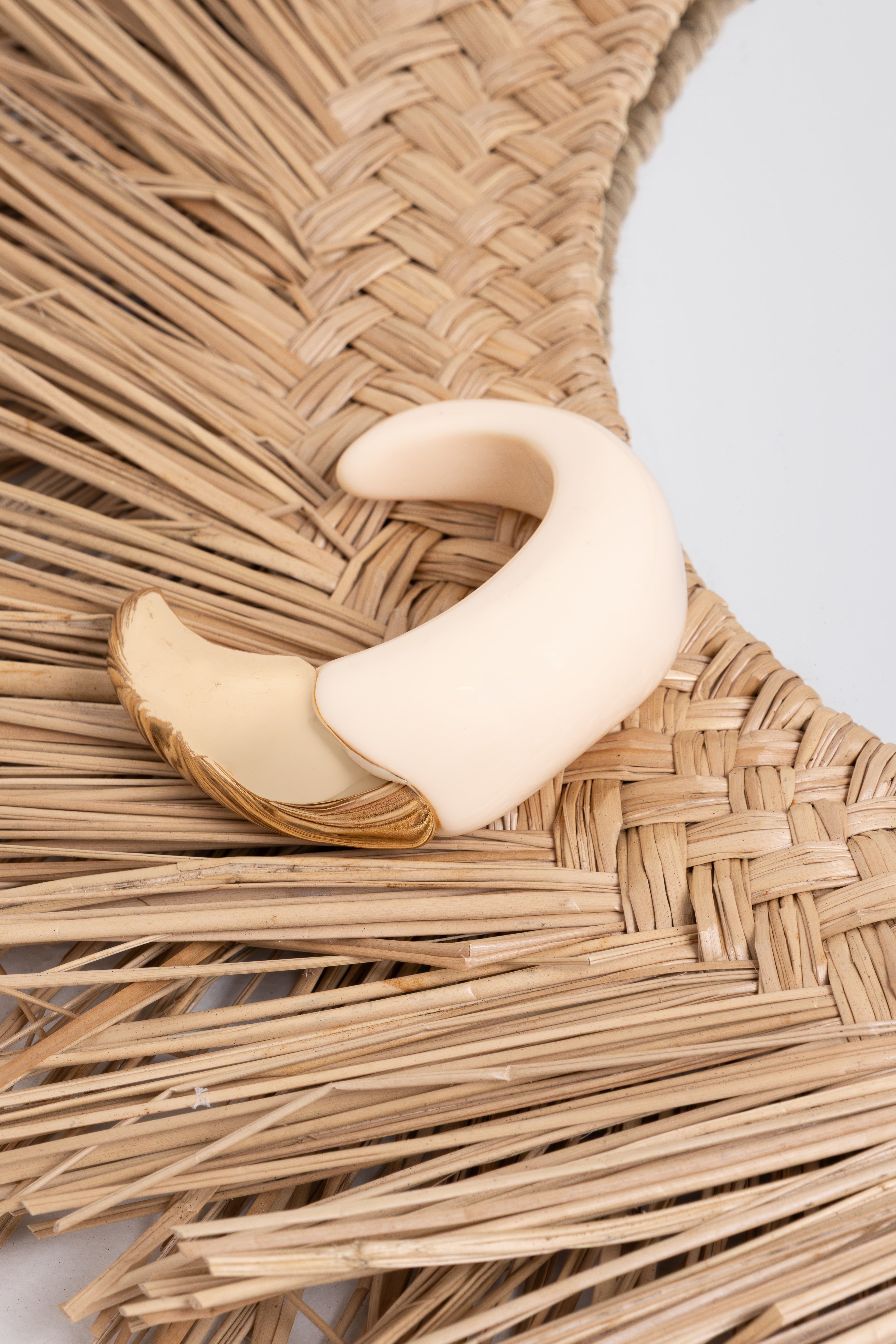 Combina resina e metal em um design contemporâneo que privilegia linhas limpas e estética minimalista. O contraste entre os materiais acrescenta sofisticação, resultando em um acessório moderno, versátil e de presença elegante.