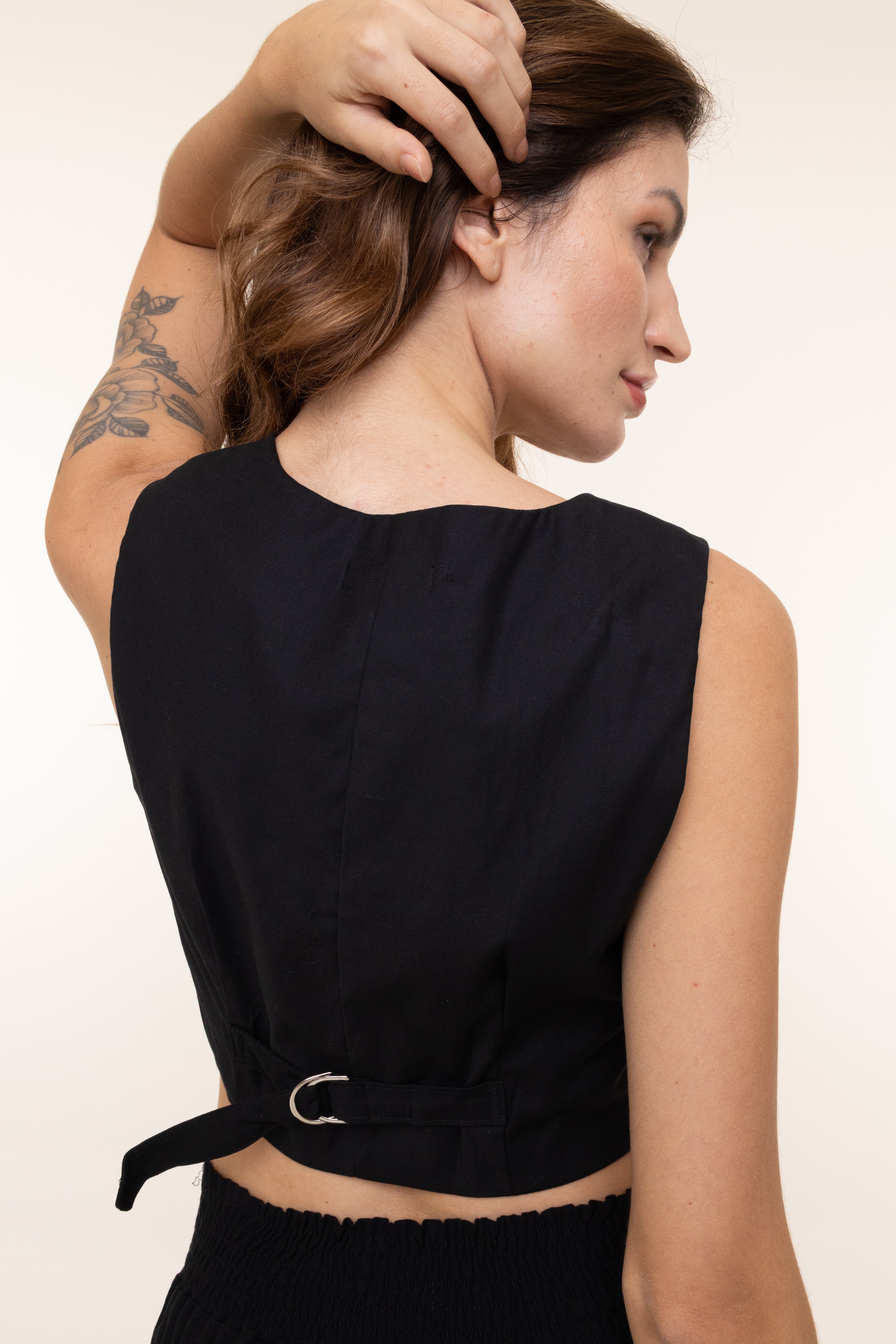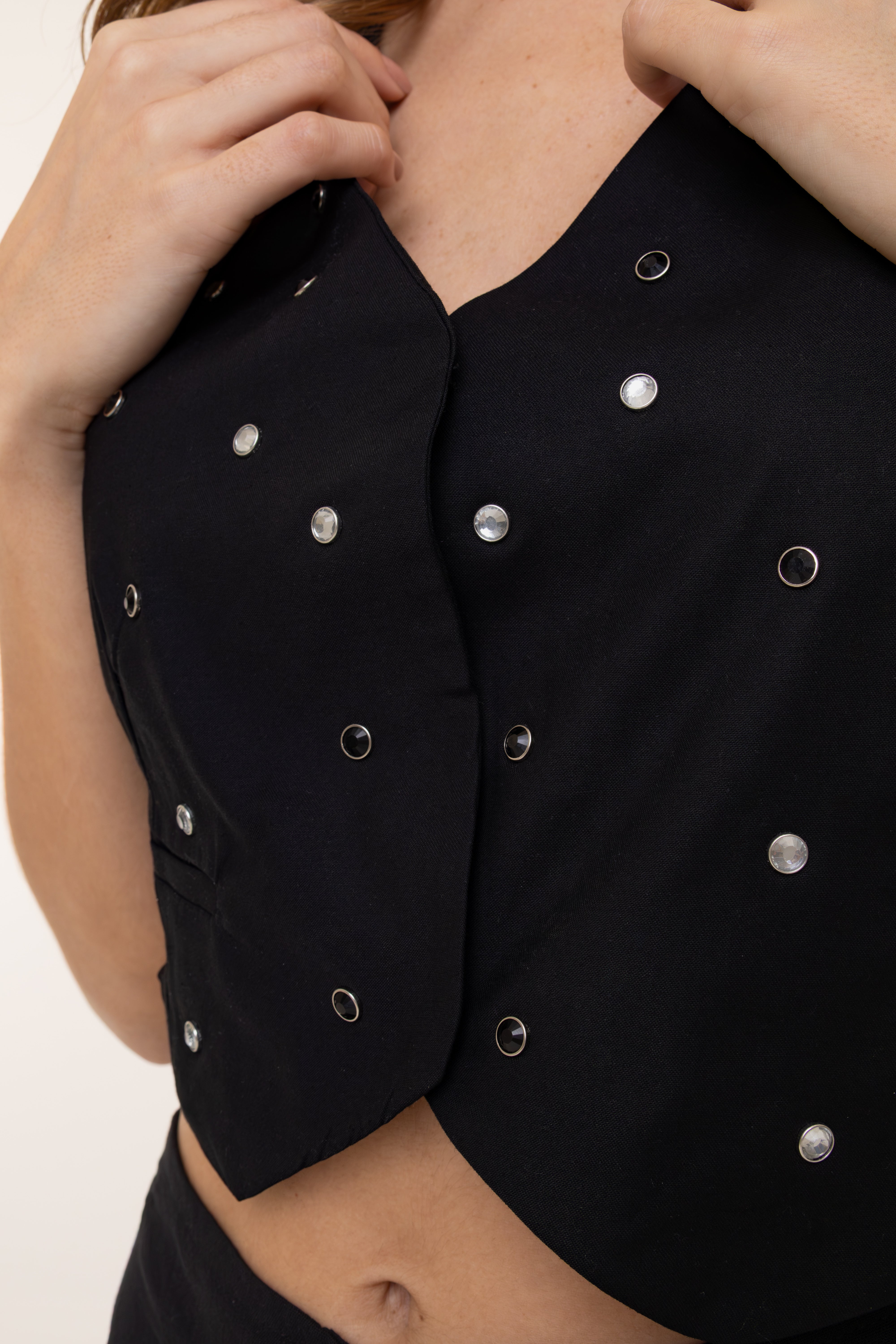 Confeccionado em 97% algodão e 3% elastano, com forro 100% poliéster. Combina conforto, flexibilidade e estilo. Suas aplicações delicadas adicionam charme e sofisticação ao visual, tornando-o perfeito para complementar looks casuais ou produções mais elegantes.