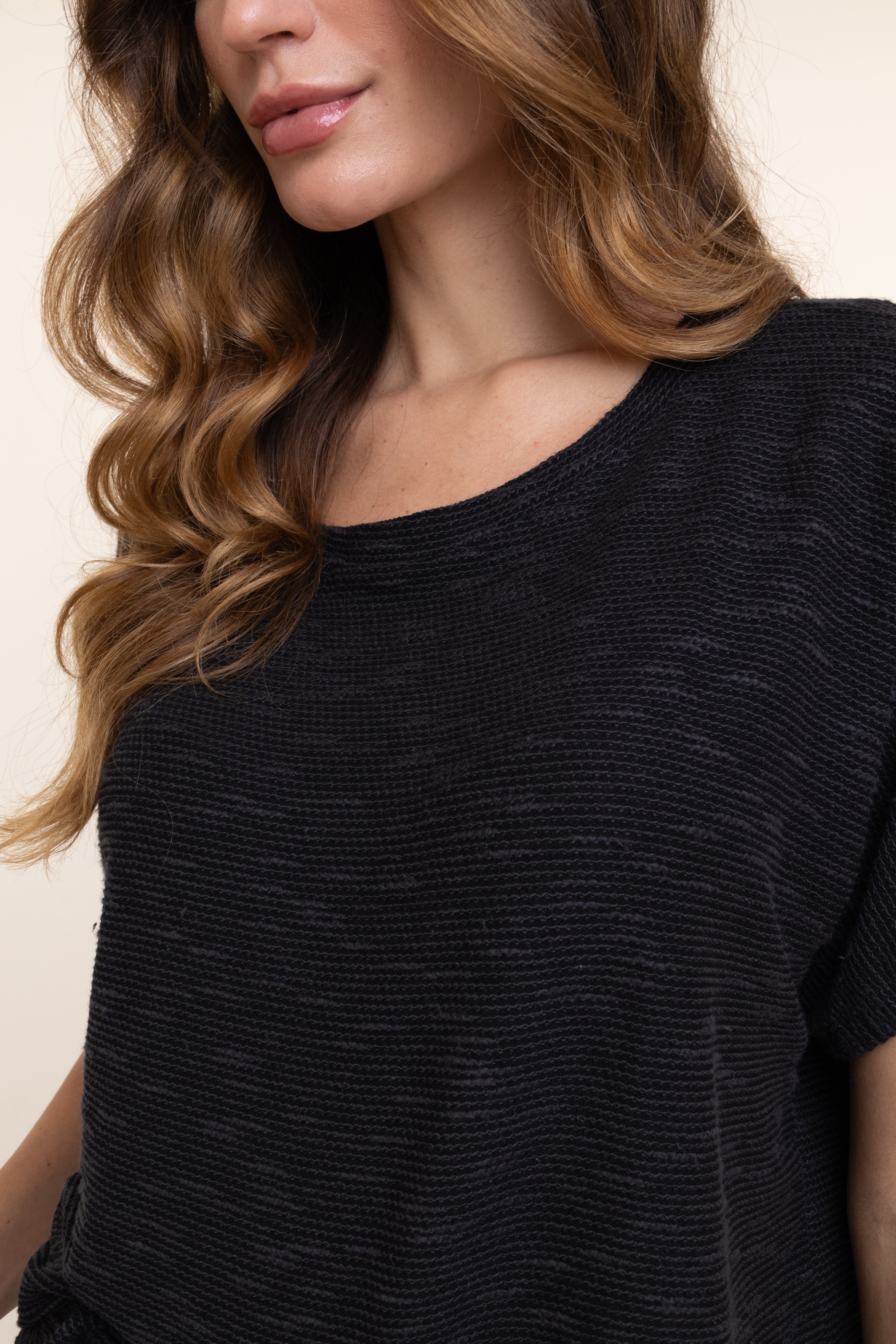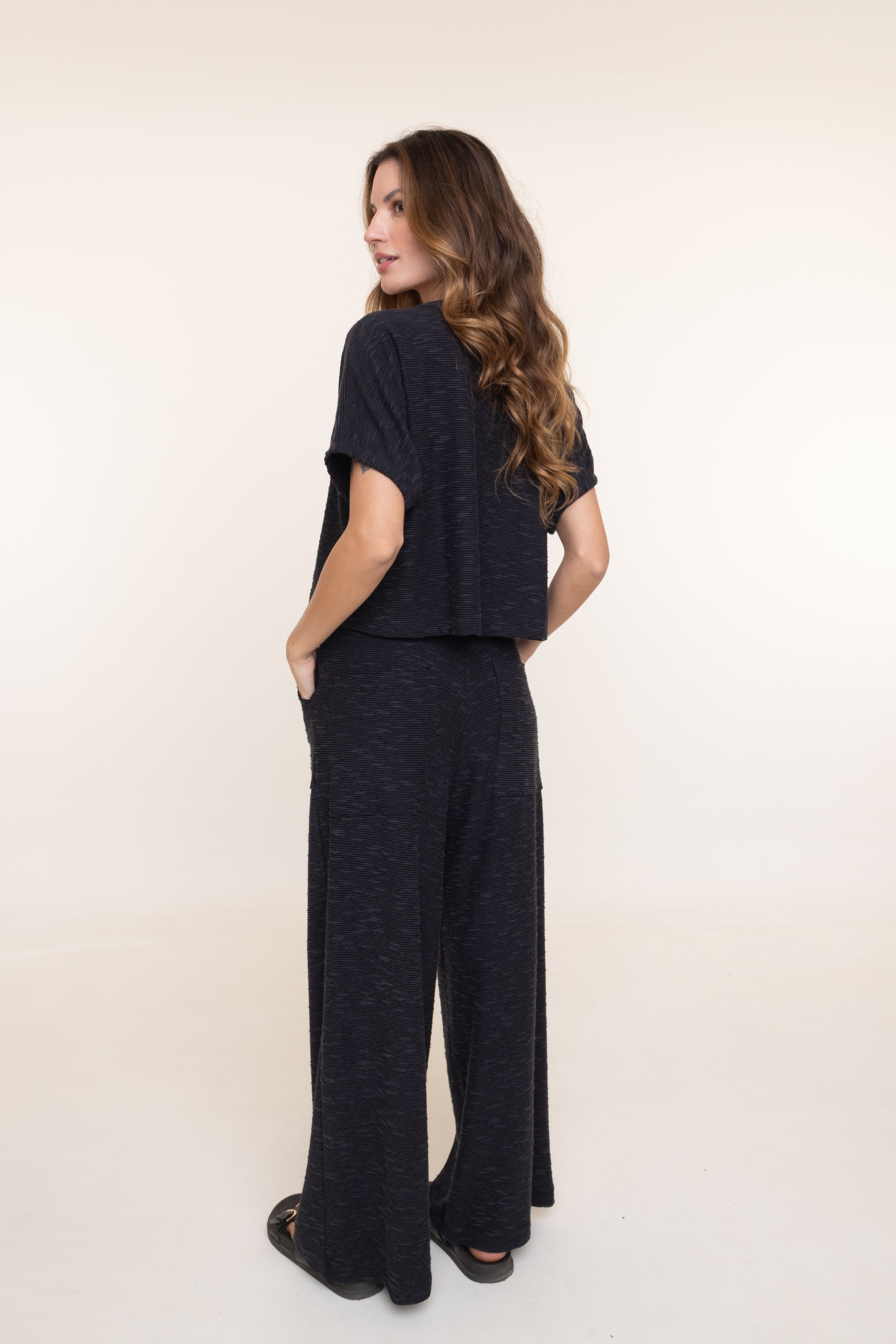 Confeccionado em 77,5% viscose, 21% algodão e 1,5% elastano, oferece conforto, elasticidade e caimento impecável. Ideal para looks casuais ou produções descontraídas, combina praticidade com estilo, garantindo versatilidade e bem-estar ao longo do dia.