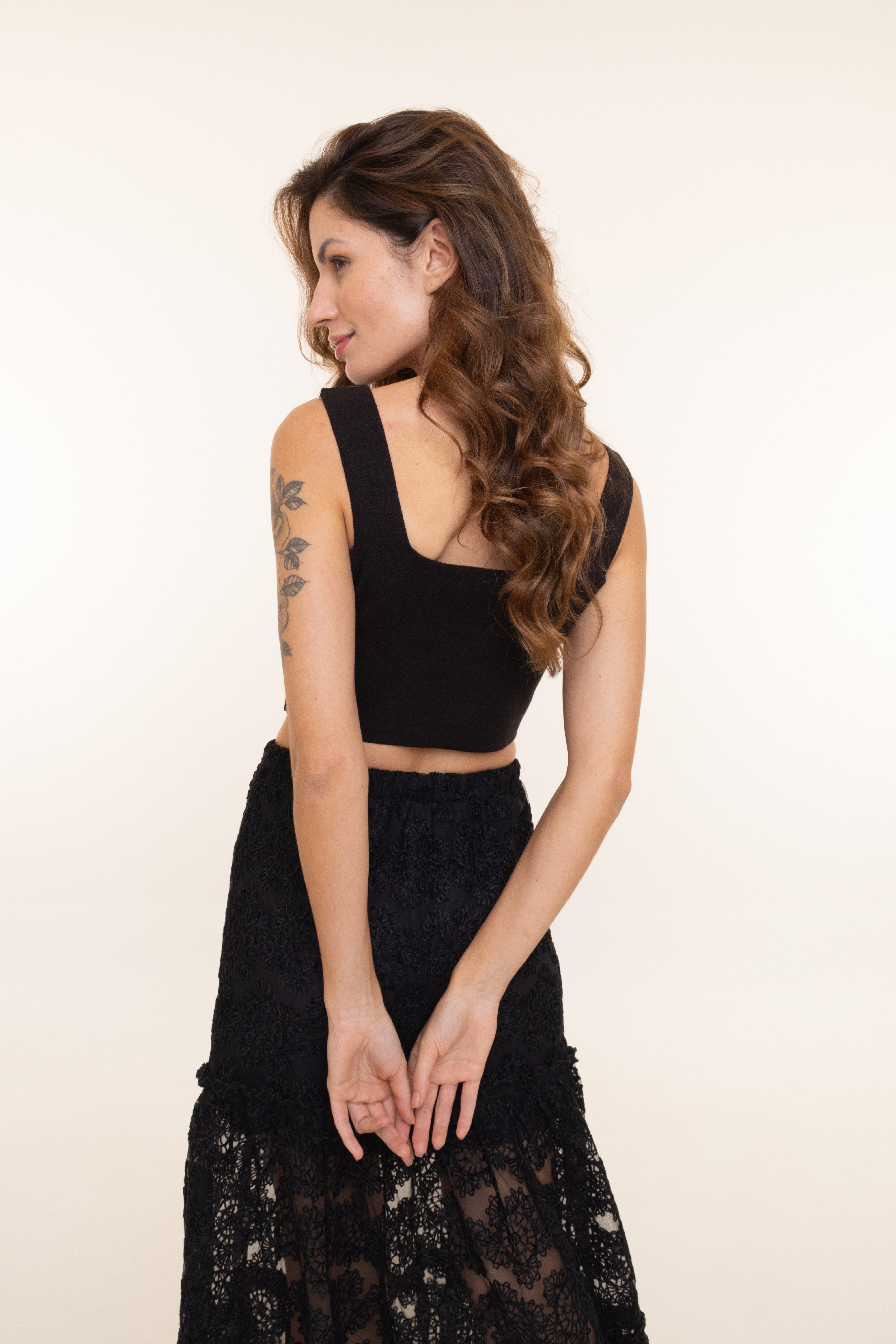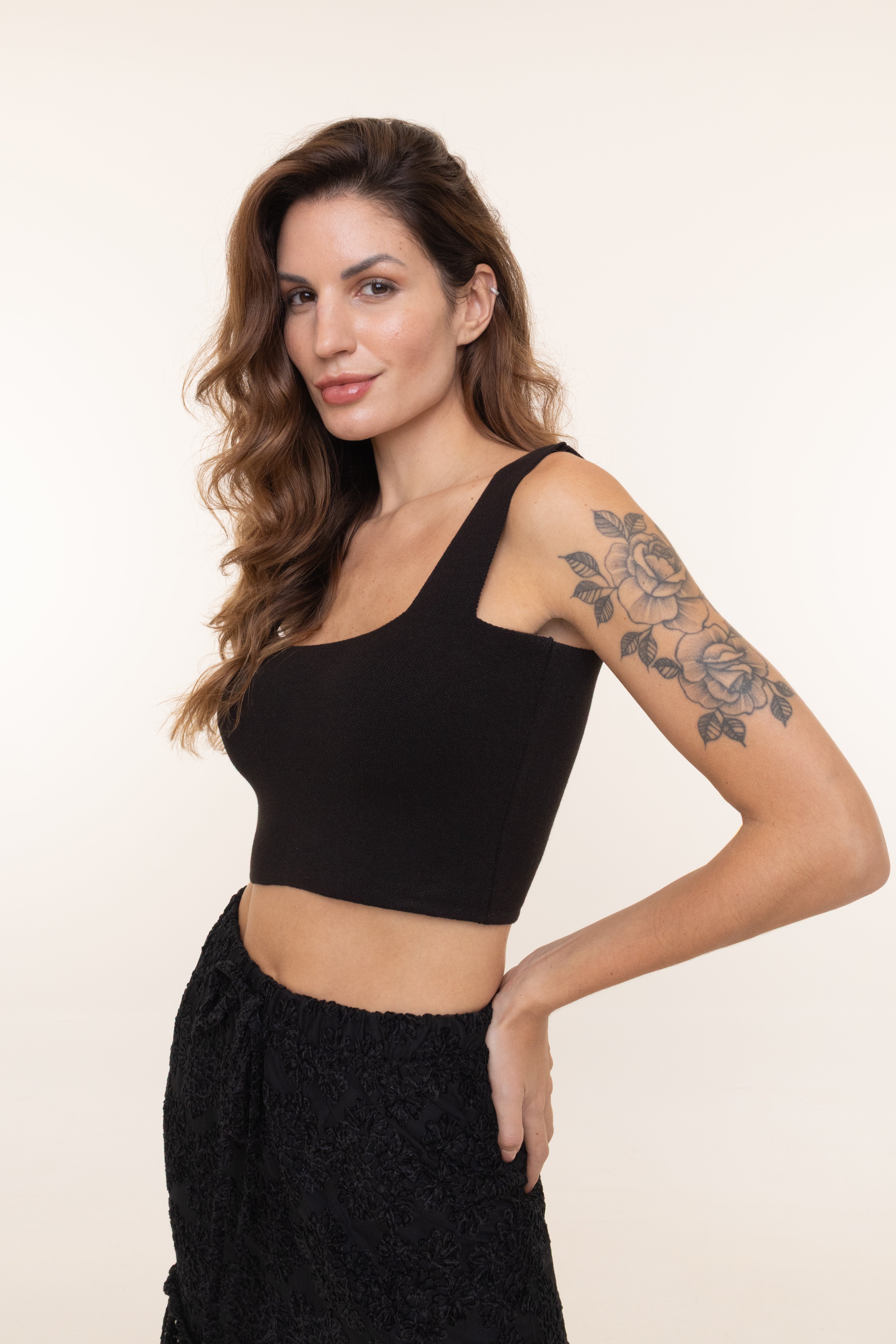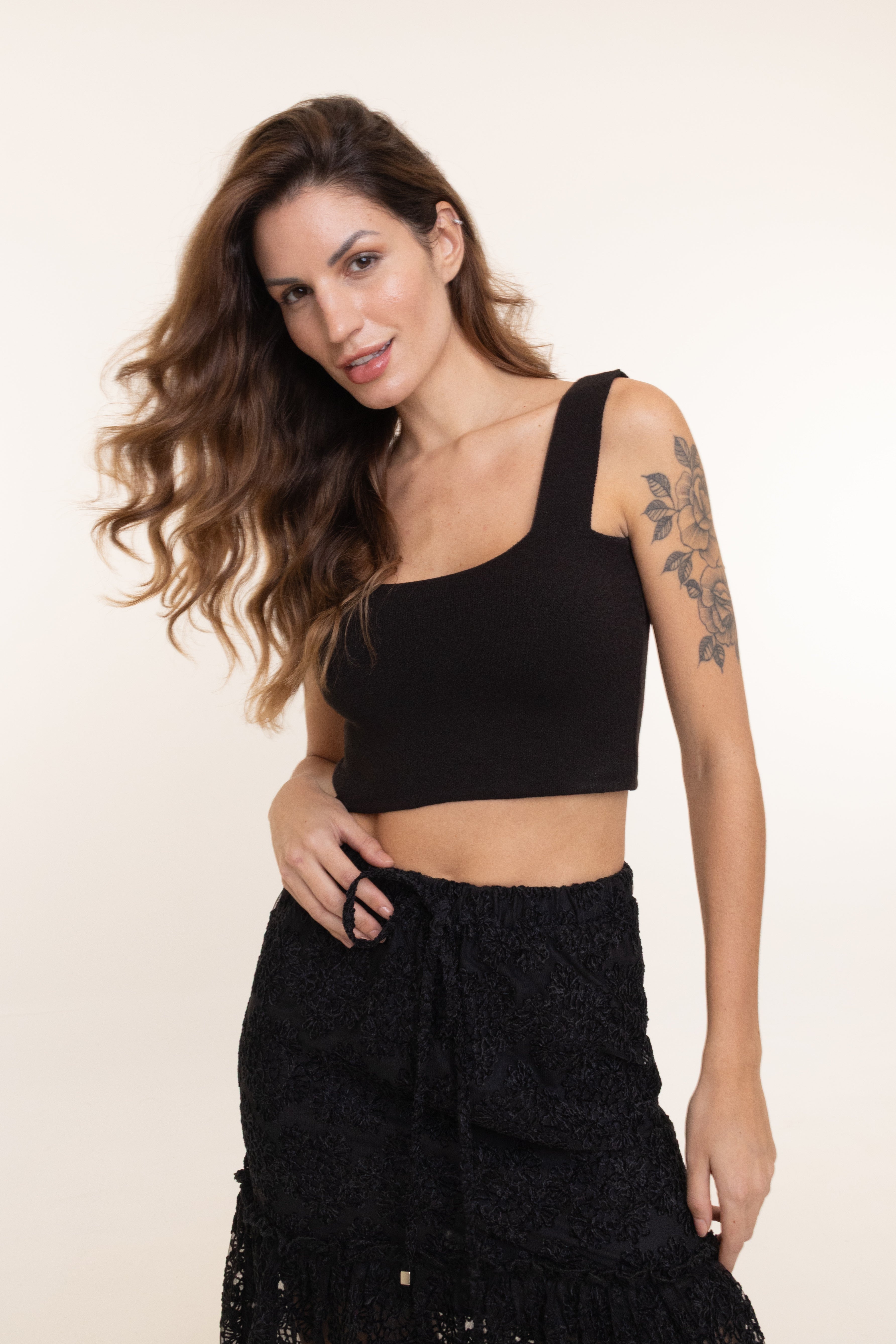 Confeccionado em 48% acrílico, 48% viscose e 4% elastano, oferece conforto, elasticidade e caimento perfeito. Seu modelo de alças garante leveza e versatilidade, permitindo combinações modernas e elegantes, do casual ao sofisticado, adicionando charme e estilo ao look.