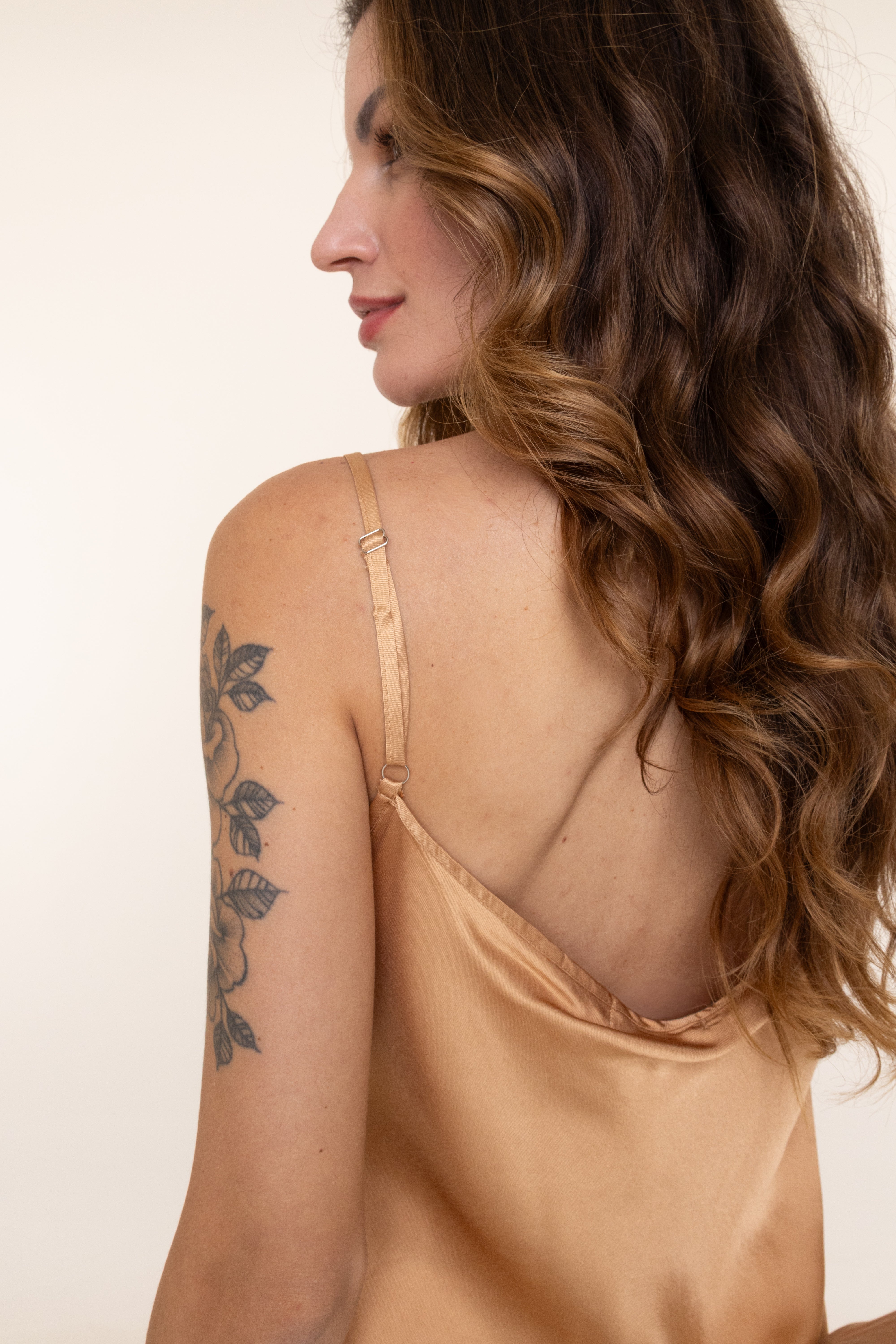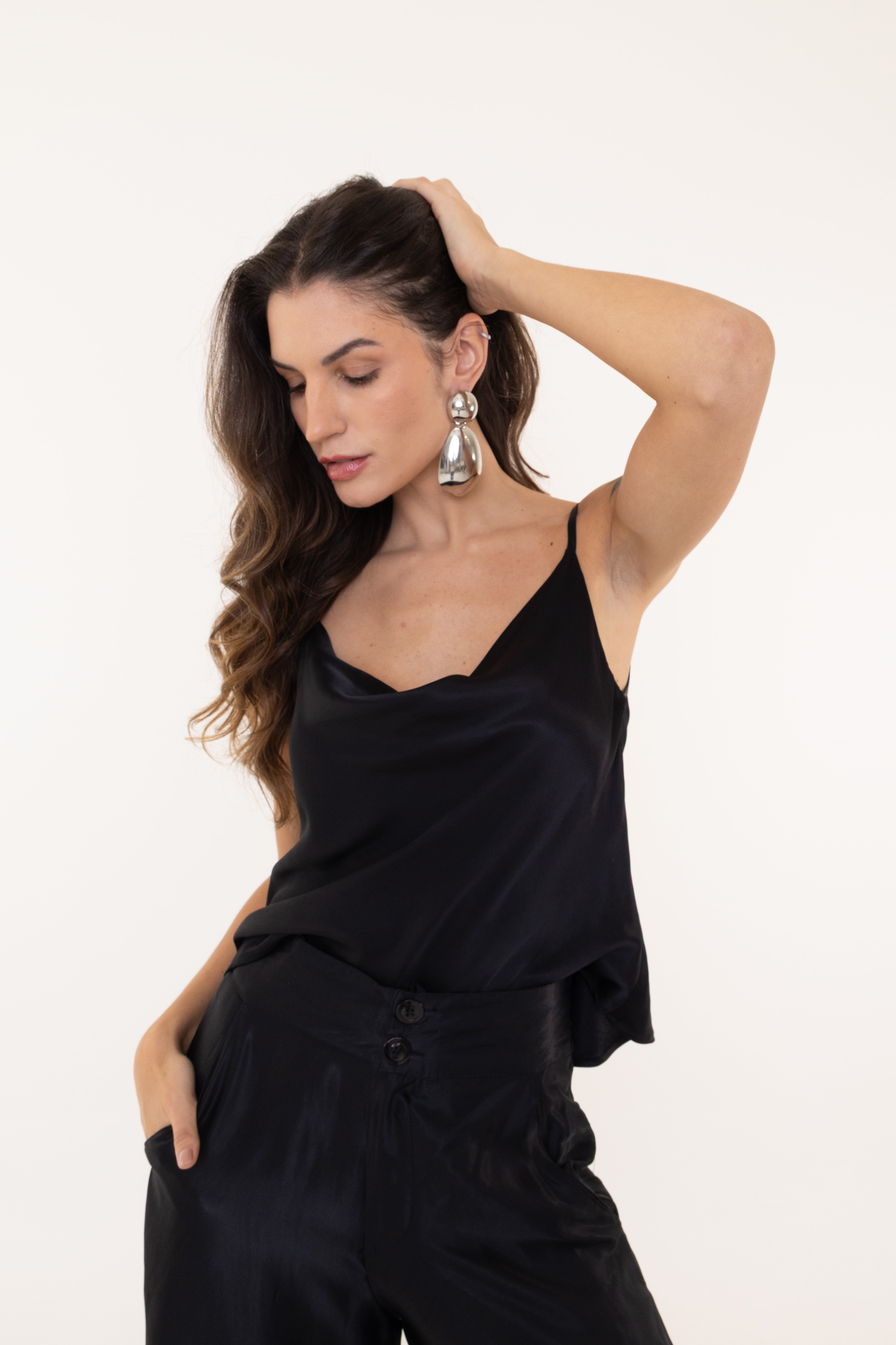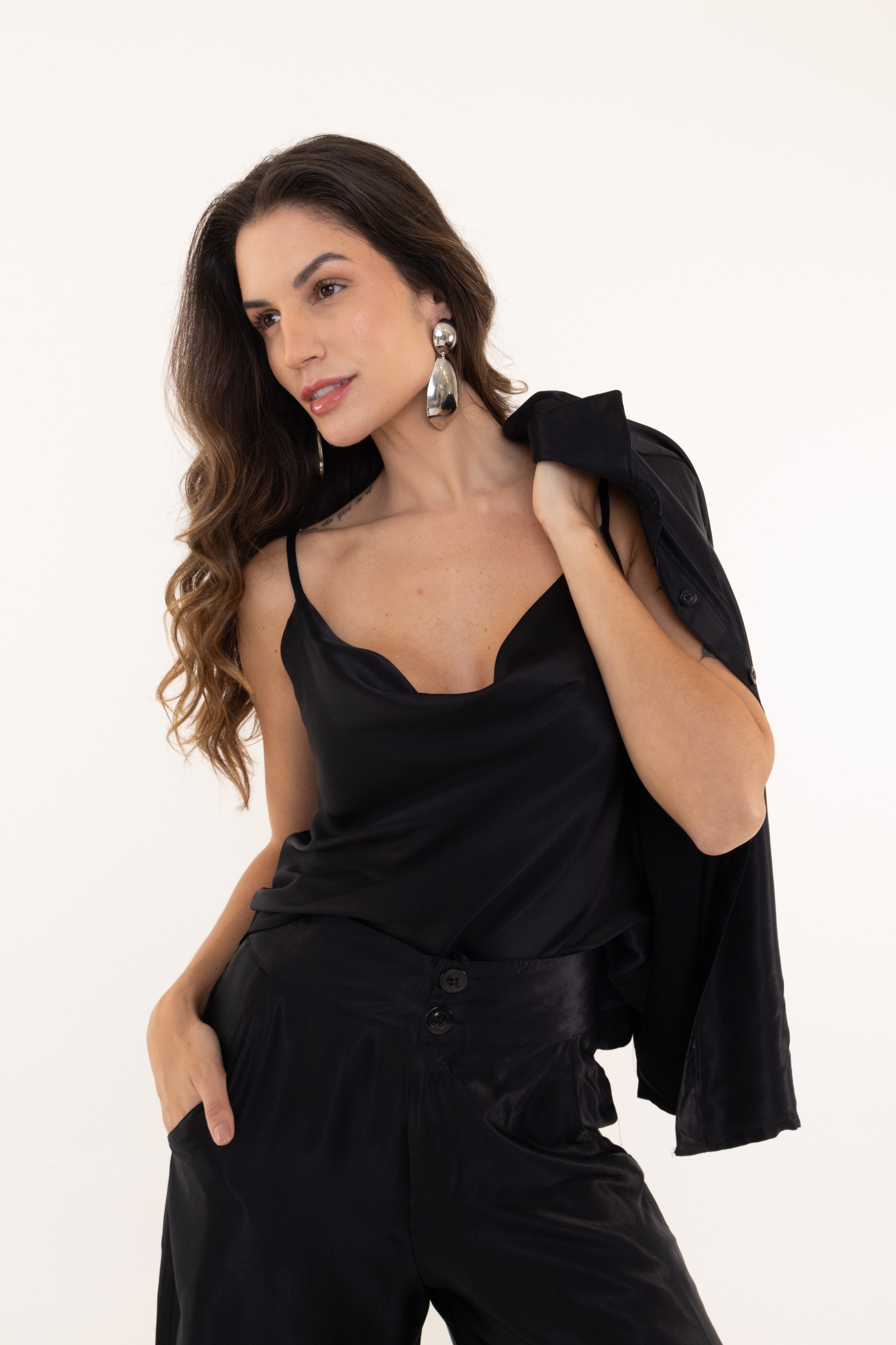 Confeccionada em 100% viscose com acabamento em cetim, oferece leveza, caimento fluido e toque sofisticado. Ideal para compor looks elegantes ou casuais, adiciona charme e brilho sutil à produção, tornando-a versátil para diferentes ocasiões.