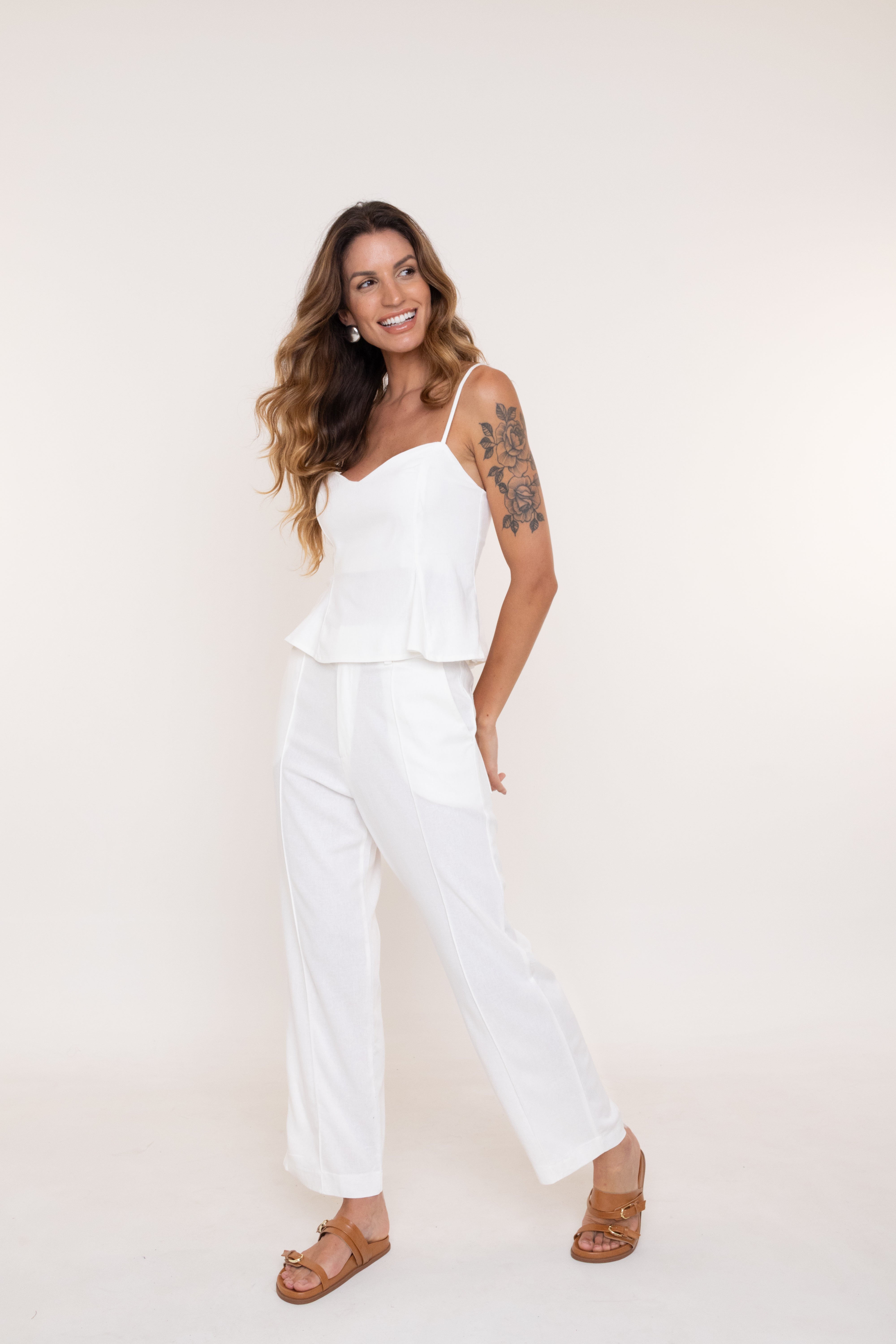 Une leveza e elegância. Confeccionada em 65% viscose, 30% linho e 5% elastano, oferece toque macio, frescor e leve elasticidade para um ajuste confortável. Uma peça versátil para looks sofisticados e atuais.