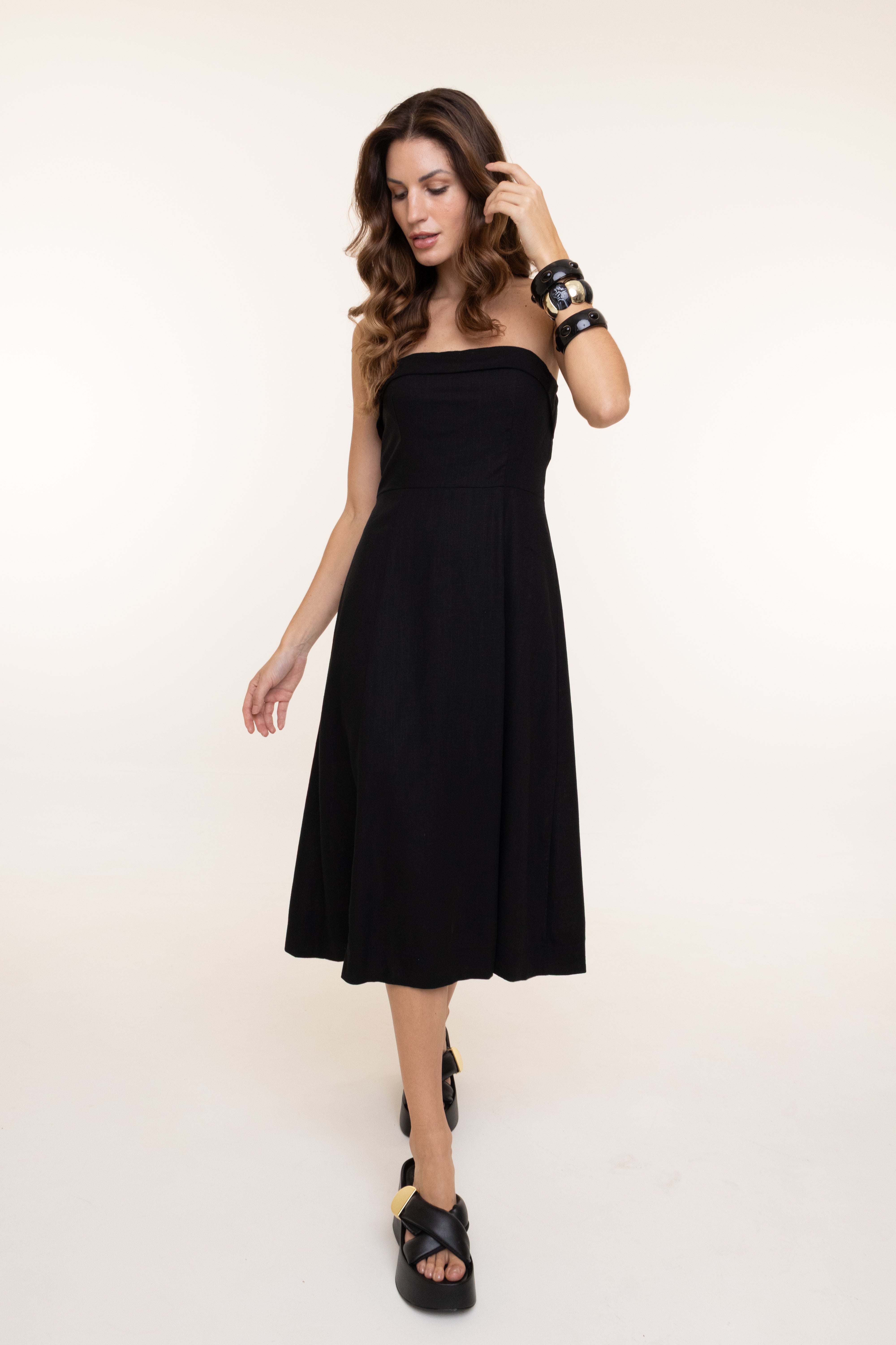 Confeccionado em 80% viscose e 20% linho, com forro 100% poliéster. Oferece leveza, conforto e caimento fluido. Seu modelo evasê confere movimento e elegância ao look, tornando-o ideal para produções casuais ou ocasiões especiais, com estilo moderno e sofisticado.